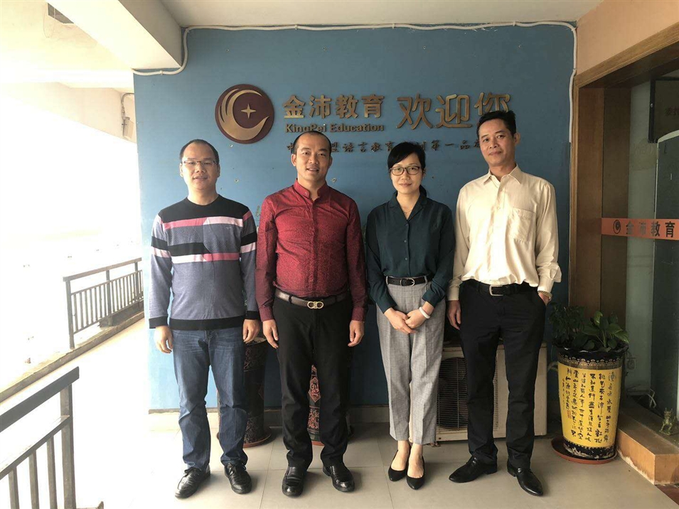 廣西金沛教育執(zhí)行董事粟宥朝(左二)、國(guó)際部合伙人許顯鋒(左一)與廣西國(guó)際文化交流中心副秘書長(zhǎng)羅琨(右二)、經(jīng)濟(jì)科技部部長(zhǎng)吳偉(右一)一行合影留念