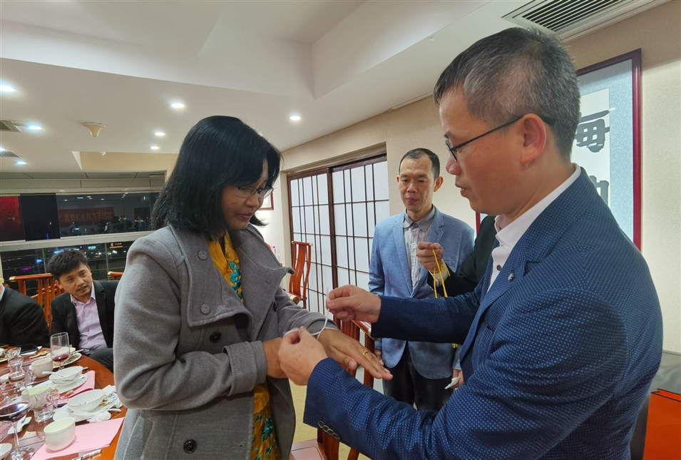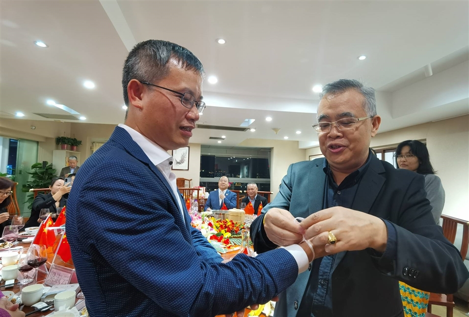 (老撾駐南寧總領(lǐng)事館總領(lǐng)事維拉薩宋蓬先生為致公黨廣西區(qū)委秘書長兼辦公室主任李永政先生栓線禮節(jié))