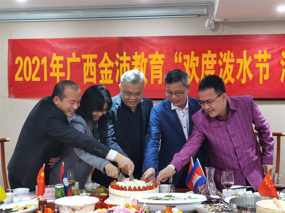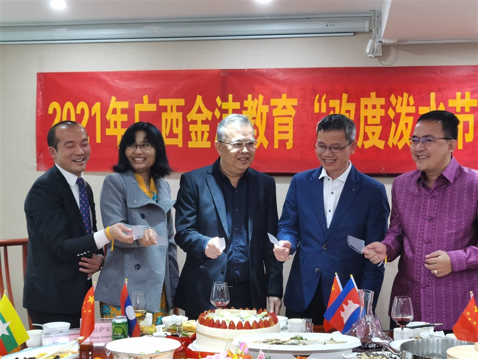 (老撾駐南寧總領(lǐng)事館總領(lǐng)事維拉薩宋蓬先生、柬埔寨駐南寧總領(lǐng)事館領(lǐng)事龍瓦塔納先生、緬甸駐南寧總領(lǐng)事館領(lǐng)事佳吉文女士、致公黨廣西區(qū)委秘書長兼辦公室主任李永政先生、廣西金沛教育執(zhí)行董事粟宥朝先生共切潑水節(jié)及中國共產(chǎn)黨成立100周年蛋糕)