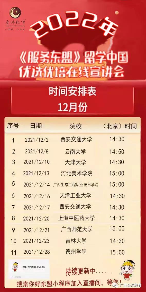 2021122日起,由我司聯(lián)合多所高校開(kāi)展的“2022年留學(xué)中國(guó)優(yōu)選優(yōu)培線(xiàn)上直播宣講會(huì)將積極利用直播新形勢(shì)在你好東盟微信小程序上進(jìn)行開(kāi)播。學(xué)校和師生、家長(zhǎng)可通過(guò)小程序你好東盟、FacebookYoutube直播等多種途徑收看本次宣講會(huì)。