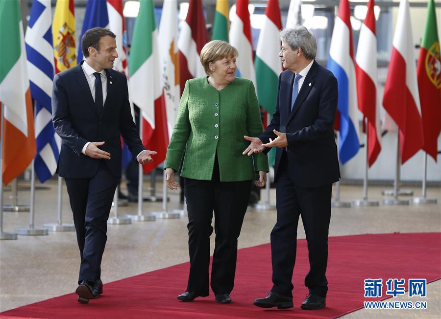 2月23日,在比利時(shí)首都布魯塞爾,法國(guó)總統(tǒng)馬克龍(左)、德國(guó)總理默克爾(中)和意大利總理真蒂洛尼抵達(dá)峰會(huì)會(huì)場(chǎng)。