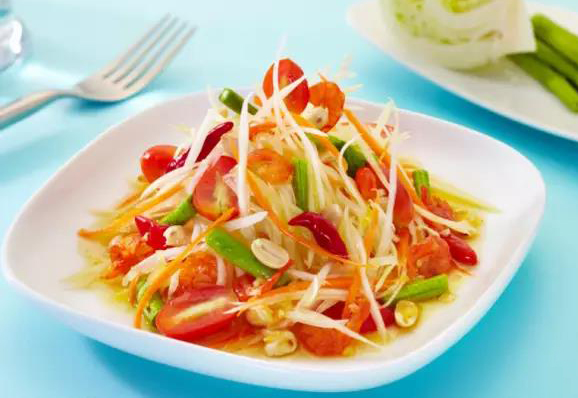 一道味道十分濃烈的沙拉,也是一種深受老撾人喜愛的涼菜,與一般的水果沙拉不同,青木瓜沙拉的主料為生木瓜,剁切成極細(xì)的絲,用鹽控去苦澀,以魚露、辣椒、蔥、蒜等舂拌,酸辣香脆,清涼爽口,當(dāng)?shù)厝瞬坏燥垥r吃,有時還當(dāng)零食享用,在街邊的小攤上顧客可以自選輔料然后放進(jìn)研缽中搗成沙拉。