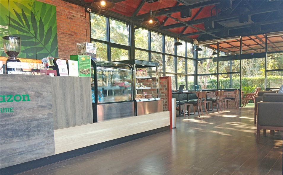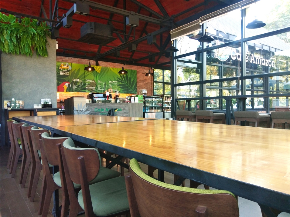 亞馬遜咖啡館的紅磚外墻與干凈明亮的落地窗相映,充滿休閑氣息。室內寬敞整潔,歸本主義的原木桌椅,適合打發(fā)午后的閑暇時光。