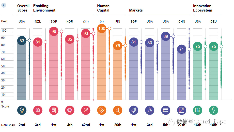 今年,世界經(jīng)濟論壇對評分進(jìn)行了大幅調(diào)整,把未來技術(shù)驅(qū)動的經(jīng)濟成長作為導(dǎo)向,加入了多項新指標(biāo),從創(chuàng)新能力、開放性和靈活性等12項類別的98個要素進(jìn)行綜合考察。
