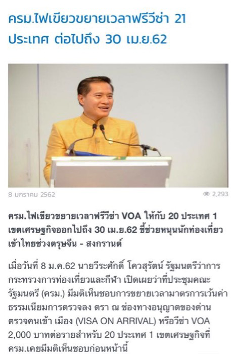 新京報訊(記者 王勝男)據(jù)泰國媒體《曼谷商業(yè)新聞》、《曼谷郵報》等報道,1月8日,泰國旅游與體育部長威拉薩在內(nèi)閣會議結束后宣布,為刺激泰國旅游,泰國內(nèi)閣通過了將免除泰國落地簽證費政策延長3個月至2019年4月30日的提案,并表示落地簽免費政策的延長將促使春節(jié)和泰國潑水節(jié)期間的來泰旅客人數(shù)增加。目前此項法案還需經(jīng)泰國王室公報公告才能生效。
