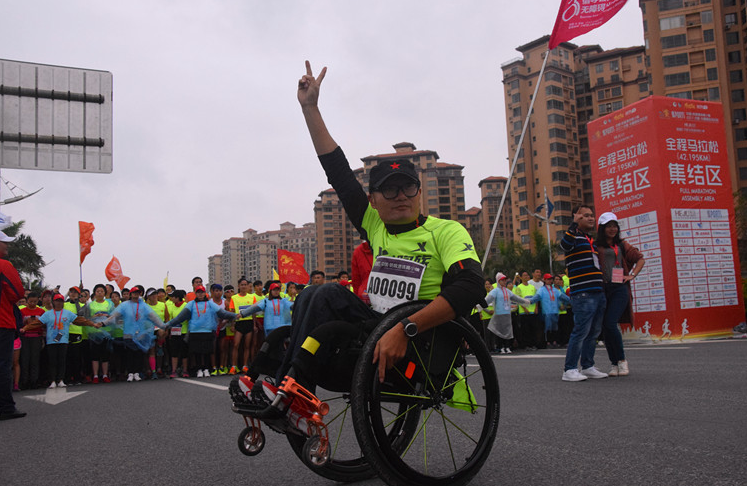 在眾多的選手中,坐在輪椅上的張先生顯得尤為搶眼。張先生來自廣州,他告訴記者,這是他參加的第54場馬拉松比賽,也是第一次參加全海景跑道的馬拉松, “我參加比賽不是為了出成績或出風(fēng)頭,而是重在參與,是想體現(xiàn)一種精神。”張先生說,他不一定能全部“跑”完全程,但他一定會堅持到最后。