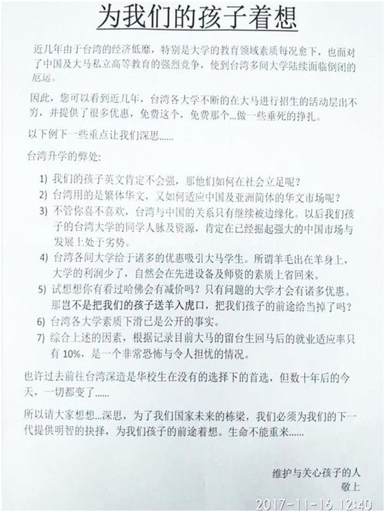 公開信同時列舉臺灣升學七大弊端,其中第二點是,“臺灣用的是繁體華文,又如何適應中國及亞洲簡體的華文市場呢?”第三點是“不管你喜不喜歡,臺灣與中國的關系只有繼續(xù)被邊緣化。以后我們孩子的臺灣大學的同學人脈及資源,肯定在已經(jīng)崛起強大的中國市場與發(fā)展上處于劣勢”。第七點提出臺灣升學弊端的結論是,“大馬留臺學生回到馬來西亞后,就業(yè)率只有10%,是一個非??植琅c令人擔憂的情況”。